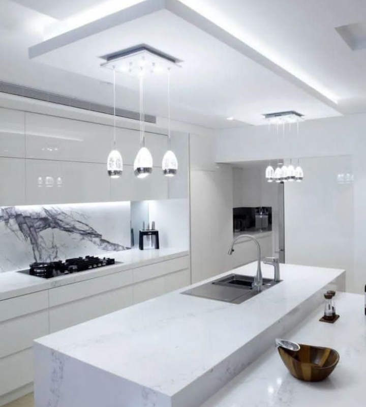 - Recessed LED lights, cove lighting, or smart lighting systems are often incorporated. - Creates ambiance and enhances the functionality of the space.